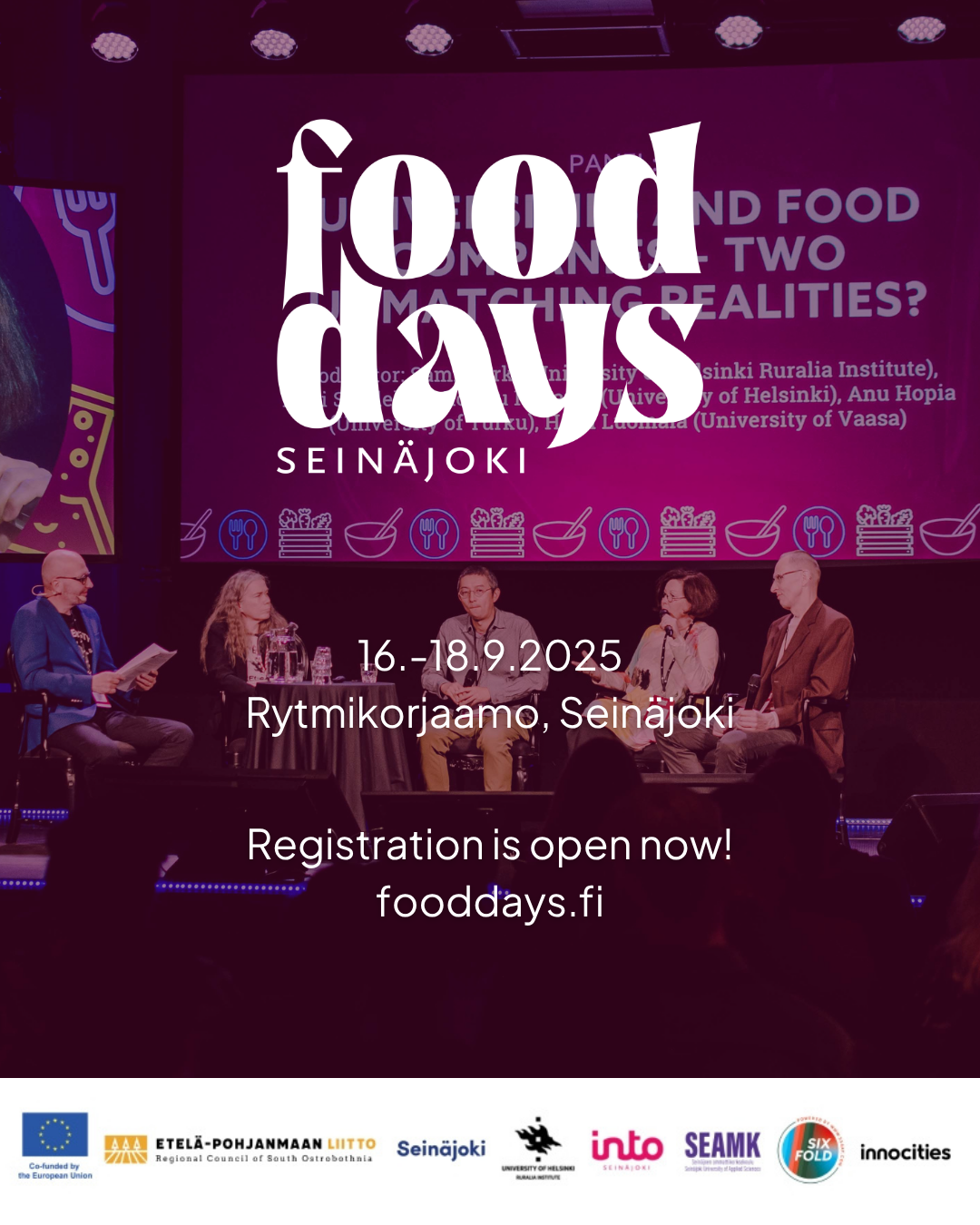Food Days is a three-day event in Seinäjoki, which is organized in collaboration by Ruralia Institute, Into Seinäjoki, and Seinäjoki University of Applied Sciences. Food Days takes place in Seinäjoki 16.-18.9.2025